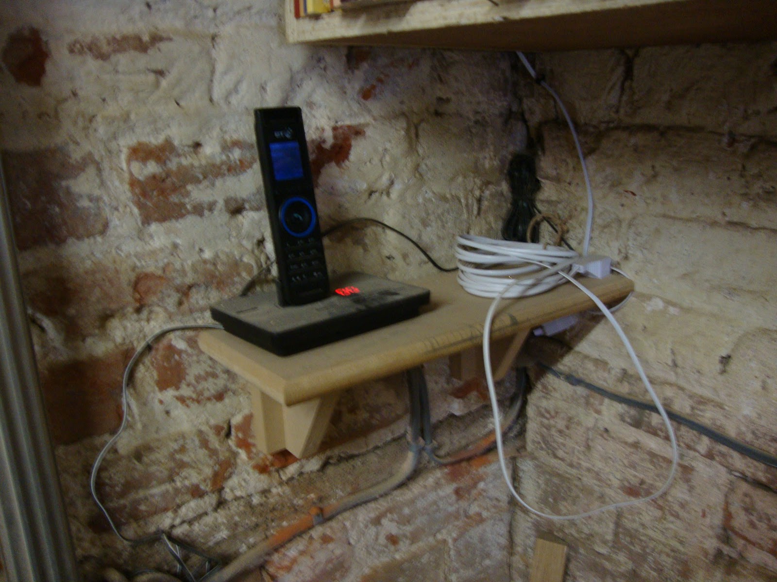 >Now, I know you are all going to have a good laugh at my current office, as you can see it consists of a mdf shelf, and a phone. I didn’t allow for a pen and pad, as I figured I could always find them on my bench no problems….how wrong could I be.  This has done the job(barely) for the past year, I’ve got broadband in the “office” but never used it, as I do most of my paperwork in the evenings at home. Well I have a couple of days before starting the next job, so thought I would make some improvements, to what can only be described as the office from hell.