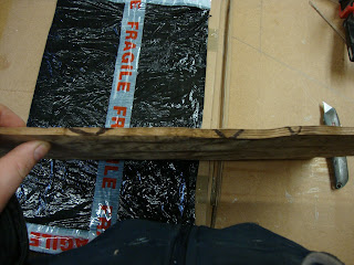 I selected the first two leaves of veneer for flattening, for this I just wipe a fairly wet rag with clean water over both sides of veneer, lay on a plastic bag, then place a plastic bag between these two also, then use my state of the art platen press.