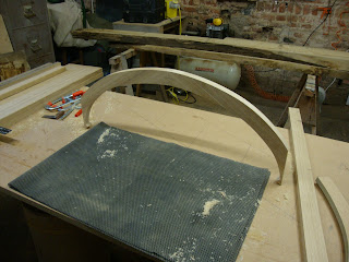 Next I made a mdf pattern for the curved bottom rail, and routed this to shape. If you look on the ends of this rail, you can see the small nib I have left for a cramping block, this end is very fragile, and the nib also prevents this from breaking(hopefully).