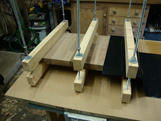 I’m just using some cauls, and a couple of thick platens for this panel, with plastic bags in between the platens and the veneered panel. It was about 9 degrees in my workshop today with the heating on, so I’m going to leave this panel in the press over night.