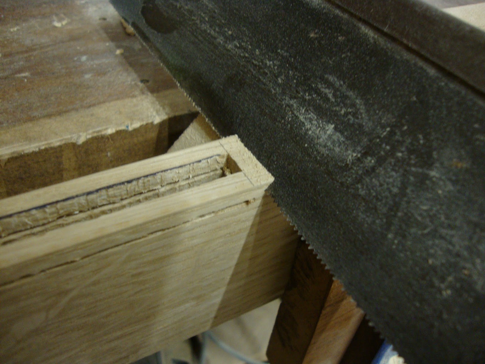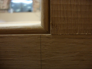 I then made a start on the face frames for the taller doors, these are having a bead all round which needs to be mitred on the rail and stile intersection. Here I am using a 2″ Ashley Iles chisel to knock the corner off ready to meet the stile.